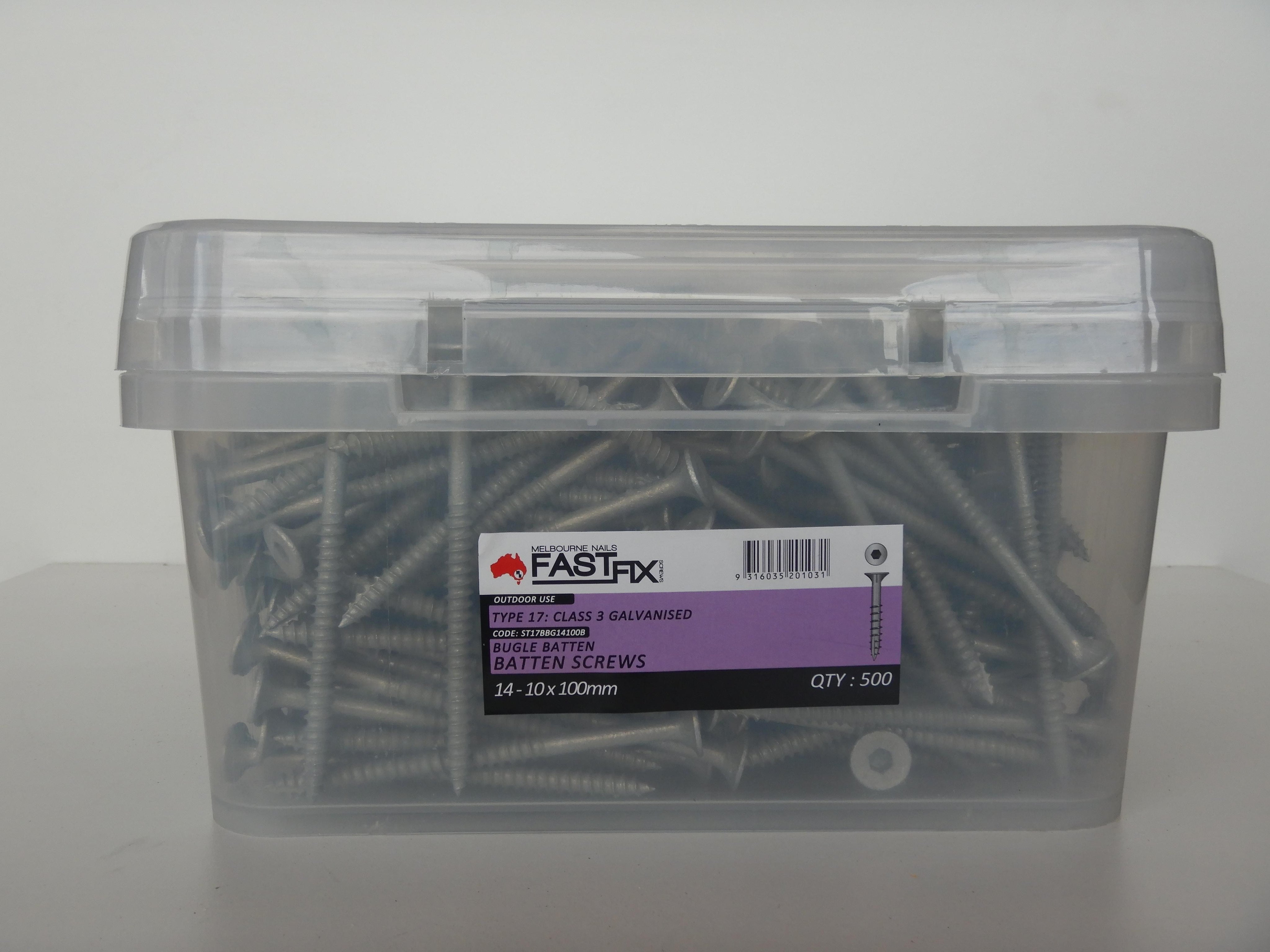 The Bugle Batten Screw 14G x 100mm (Pack of 500) is a heavy-duty timber fixing designed for strength, speed, and durability. Featuring a bugle head that sits flush without damaging the timber surface, a Type-17 self-drilling point to reduce the need for pre-drilling, and a coarse thread for superior holding power, these screws are ideal for fixing battens, framing, fencing, pergolas, and other exterior timber projects. Finished in Class 3 galvanised coating for excellent corrosion resistance, they are suitable for outdoor and treated timber applications. Supplied in a bulk pack of 500, they offer great value for both professional builders and DIY users.