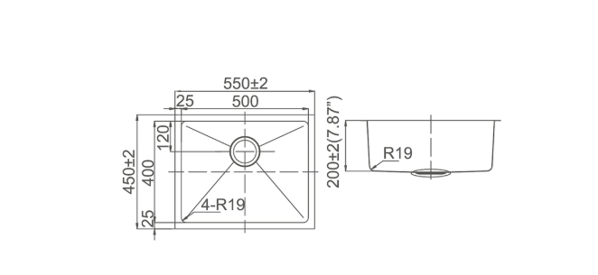 Overall dimensions: approximately 550 × 450 × 220 mm; bowl dimensions around 500 × 400 × 200 mm
